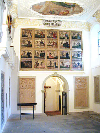 Rückwand mit dem Gemäldezyklus des Totentanzes. In der Kartusche darüber das Motto "Sagt ja, sagt nein / getanzt muss sein"