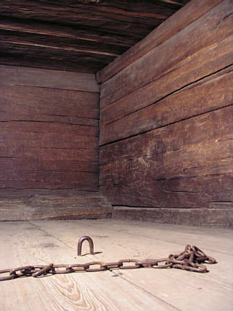 Blockgefängnis ("Blockkeuche"), nur halbhohe Kammer aus Blockbohlen, in der die Delinquenten zwischen den Befragungen oder bis zur Vollstreckung des Urteils angekettet wurden.