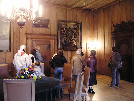 Kurfürstliches Kollegium Nordwand mit Uhr des Regensburger Uhrmachers Ulrich Graf (1624); Gehäuse von Albrecht Frick, Zifferblatt vermutlich von Johann Paul Schwendtner.