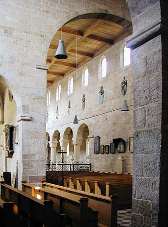 Mittelschiff mit romanischen säulengestützten Arkaden, im vorderen Bereich (vermutlich im Bereich des Chorgestühls) nach Hirsauer Muster geschlossene glatte Wand zum Seitenschiff.