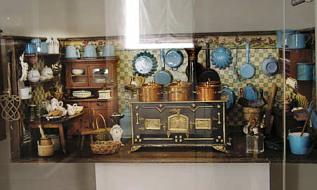 Puppenküche, Spätes 19. Jahrhundert Freistehender Herd mit drei Feuerstellen, Geschirrschrank, blau emailliertes Kochgeschirr