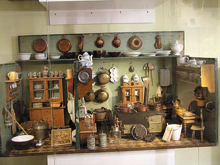 Puppenküche, Ende 19. Jahrhundert Freistehender Herd mit Wasserschiff und Messingtüren, Geschirrschrank, zwei Geschirrregale an der Wand, Kupfer- und Messinggeschirr