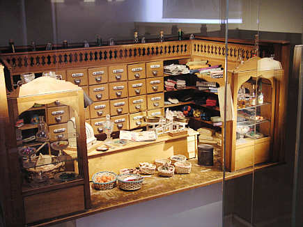 Puppenladen, Anfang 20. Jahrhundert Gemischtwarenladen mit zwei Schaufenstern zur Außenseite, Regale mit Stoffballen rechts, Schubfächer hinten.