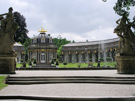 Ensemble aus Zirkelbauten mit einem zwischen ihnen gelegenen Sonnentempel, das auf der anderen Seite durch Treillagegänge vervollständigt wird und den innen liegenden Raum abschließt.