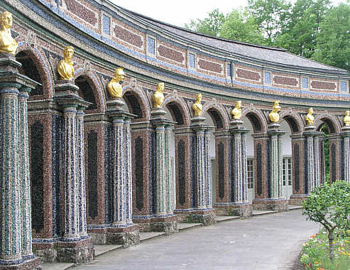 Arkadenreihe des rechten Zirkelbaus mit Inkrustationen aus farbigem Glasfluss und Bergkristall; die Säulen vor den Arkadenstützen tragen goldene Büsten