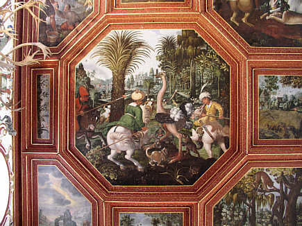 Die Decke ist am Dachgebälk abgehängt, was eine große Spannweite ermöglichte. In den großen sechseckigen Feldern sind Szenen der Großwildjagd dargestellt, die mit den Stuckfiguren an den Wänden korrespondieren. Die kleinen rechteckigen Felder zeigen Szenen der Jagd auf Niederwild.