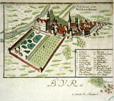 Die älteste Ansicht von Weikersheim, die Schloss und Garten zur Zeit Graf Wolfgangs zeigt, verdeutlicht bereits die dreiteilige Anlage des Gartens, die aber nicht der heutigen Anordnung entspricht.