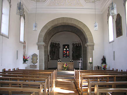 Das einschiffige Langhaus wurde in der Barockzeit umgestaltet, romanisch sind noch der Chor hinter dem halbrunden Triumphbogen, der sich links und rechts querschiffartig erweitert.