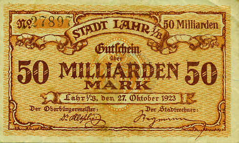 Rückseite: unbedruckt. Stempel "Stadtverrechnung Lahr (Baden)"