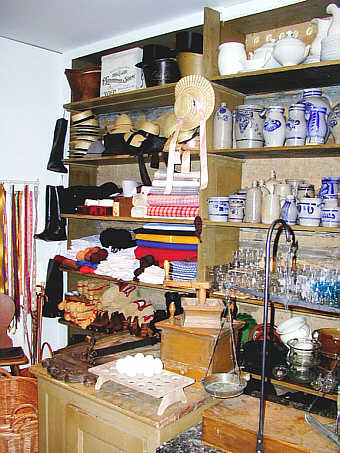 Sortiment: Glas, Steinzeug, Porzellan, Strohhüte, Haushaltstextilien, Schuhe