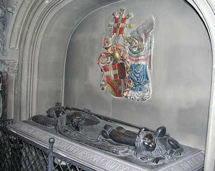 Hochgrab in zwei Etagen; oben die Liegefigur des Toten im bischöflichen Ornat in Bronze, mit umlaufender Inschrift, dahinzter an der Wand das markgräfliche Wappen.
