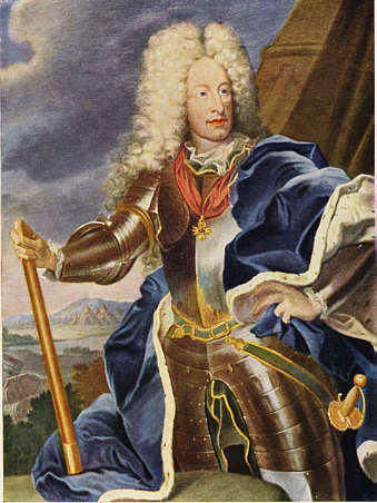im Prunkharnisch mit blauem Mantel und Feldherrnstab