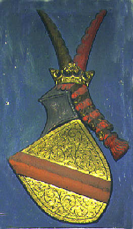 In der mittelalterlichen Heraldik wird das Wappen von einem Helm mit Helmzier bekrönt, die meistens die Wappenfarben wiederholt und eine Zuordnung zu einzelnen Linien ermöglicht. Der goldene Untergrund wurde aus Modegründen oft damasziert dargestellt.