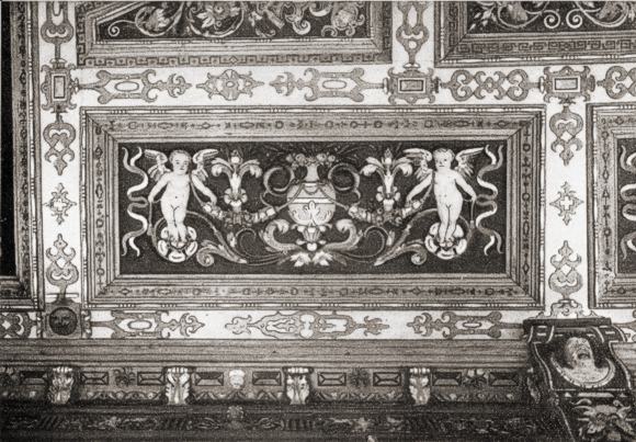 Rittersaal: Detail der Deckenschnitzereien mit Gesims und Konsolen