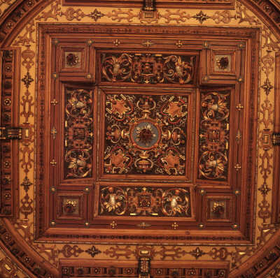 Detail der geschnitzten Kassetten-Decke aus Lindenholz