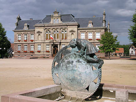 des ehemaligen Schlosses, im Vordergrund der Brunnen mit dem "Tellerschlecker",