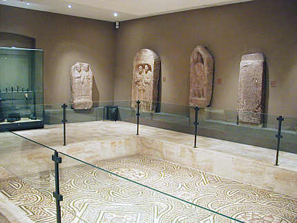 Blick in die Archäologischen Sammlungen: Grabsteine und Mosaik aus römischer Zeit