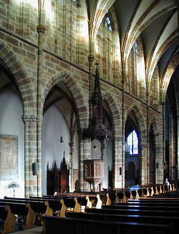 Langhaus mit Mittelschiffarkaden und Obergaden Die Fensterzone ist mit Blendarkaden bis auf den Quersims herabgezogen, während die eigentlichen Fenster wegen des Querschiffdachs nur sehr klein sein können.