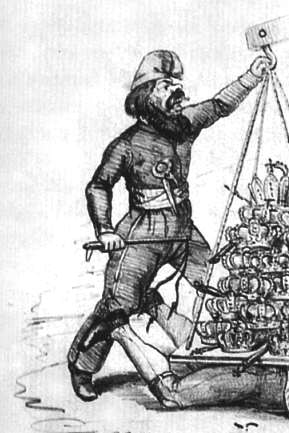 Ein Kosake (Personifikation Russlands) mit der dreischwänzigen Peitsche drückt die Waage noch zusätzlich nach unten, stützt also das unterdrückerische System der Kleinstaaterei |