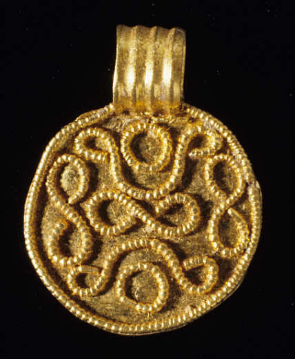 unten: Goldanhänger mit geperlter Drahtauflage