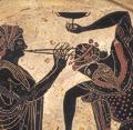 Flötenspielerin und Tänzer, Teller aus Athen,