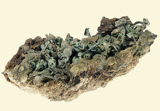 „Fibel- Depotfund“, möglicherweise Bauopfer aus Brigantium, Mitte 1. Jh n. Chr. Eisen, Bronze, Mörtel, 28x13x15,5 cm Fundort: Bregenz, 1950er Jahre © VLM