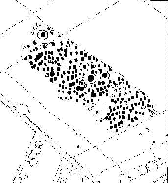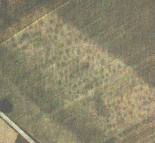 Die Umzeichnung desselben Bildes zeigt deutlich die in Reihen angeordneten Gräber und in ihrer Mitte die kreisrunden Gräben der Adelsgrablegen.