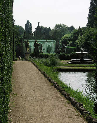 Blick aus der Mittelachse mit den hintereinandergestaffelten Brunnen und Teichen zum Dianabad.