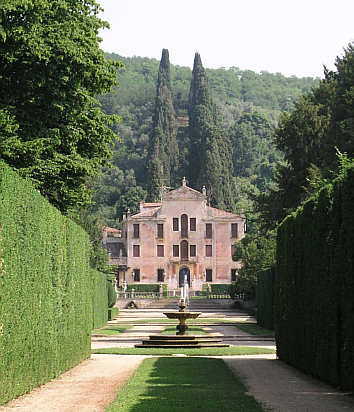 Unten Hauptallee mit der Villa Barbarigo, davor die große Terrasse und die Freitreppe zum Garten.