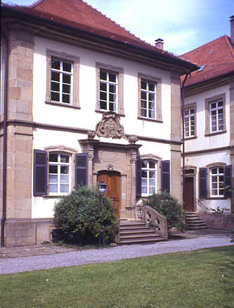 Haupteingang zum 1748 errichteten Oberen Schloss. Freitreppe mit Portal und Wappen der Gemmingen.