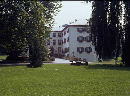 Blick durch den Schlosspark in den durch die beiden Flügel des Schlosses gebildeten Hof.