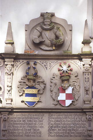 Schrifttafel, Wappen und Brustbild des Bauherrn Eberhard von Gemmingen über dem Renaissance-Portal, 1601