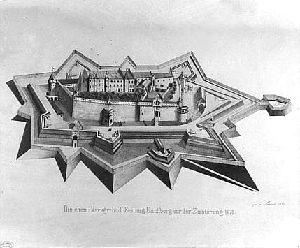 HochburgVogelschaubild der Festung vor der ZerstörungMittelalterliche Burganlage des 13. Jahrhunderts, 1553 - 77 zur geschützsicheren Festung ausgebaut. Nach 1613 und erneut nach 1660 Anlage des bastionären Außenrings. Zerstört 1689 auf Befehl der französischen Besatzung in Freiburg.