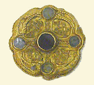 Bilder: Goldfibel (oben), Zierscheibe mit Lanzenreiter (Mitte), Tonkrug (unten), alle © Stadtmuseum Esslingen