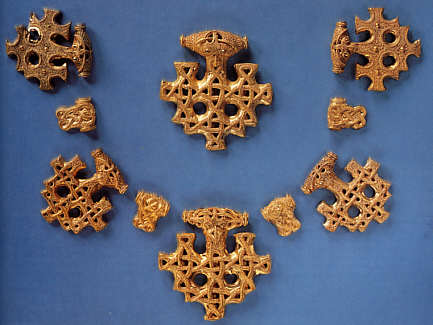 Kreuzanhänger mit vogelkopfförmigen Tragösen. das Kreuz stellt eine Verbindung von christlichem Krückenkreuz und heidnischem Thorshammer dar.