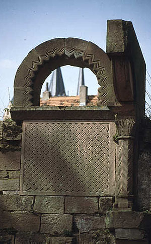 Links und unten: Kaminplatten im ehemaligen Festsaal der Pfalz (linke und rechte Seite) mit Flechtbandornament und gezackten Überfangbogen.