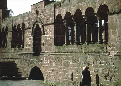 Oben: Hofseite des Palas mit den (offenen) Fensterarkaden und dem über eine Freitreppe zugänglichen Hauptportal.