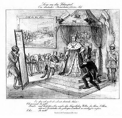 Satire auf die Ereignisse des 18. März 1848 in Berlin und die Rolle des Königs.