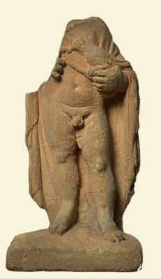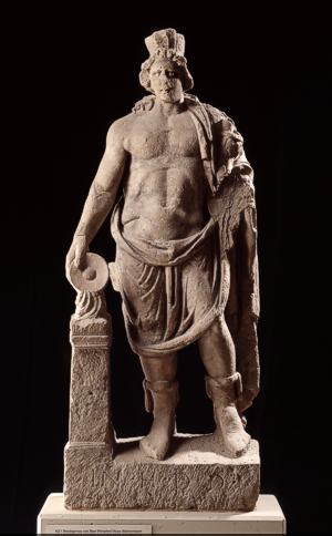 mit einem Hüftmantel. In der Rechten hält er eine Opferschale über