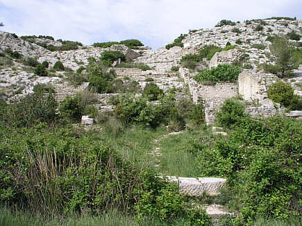 Spätantiker Mühlen-Großbetrieb Gesamtansicht vom unteren Weg aus: Östliche und westliche Mühlenreihe mit Versorgungsbereich in der Mitte.