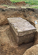 Schnell zeigte sich, dass die Denkmalpfleger den richtigen „Riecher“ hatten. Die vom Erftverband beauftragte archäologische Fachfirma Archaeonet aus Bonn wurde in kürzester Zeit fündig. Trotz einer großflächigen Beseitigung wichtiger Bodenschichten für die Ziegelproduktion im 19. Jahrhundert stieß der für den vorsichtigen Bodenabtrag zuständige Bagger neben Spuren eines römischen Weges auf eine große, grauviolette Sandsteinplatte. Diese bildete den Deckel eines etwa 2,30 × 1,10 Meter großen Steinsarges. Solche römischen Sarkophage (griech. „fleischfressend“) sind Ausnahmefunde, die ab dem 3. Jahrhundert n. Chr. in den nördlichen Provinzen vereinzelt für die Bestattung wohlhabender Römerinnen und Römer Verwendung gefunden haben.