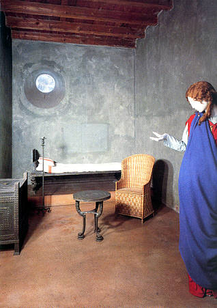 Die Einrichtung besteht aus einer Liege, einer Kommode und einem Korbstuhl mit Tischchen. Die Puppe trägt Frauenkleidung des 1. Jahrhunderts n. Chr.