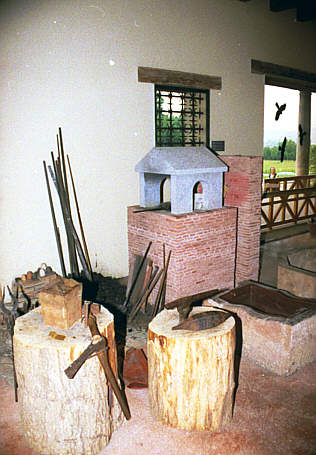 Rechts am Bildrand das Becken für die Glut, davor auf dem Holzklotz ein Roheisenbarren, wie er in dieser Form schon in keltischer Zeit in Gebrauch war.
