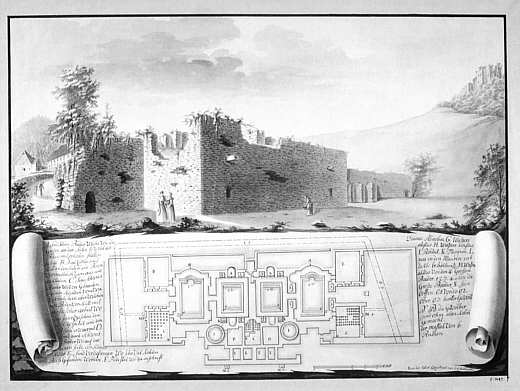 Ansicht der Badruine von Nordosten und Grundriss der Anlage, 1784