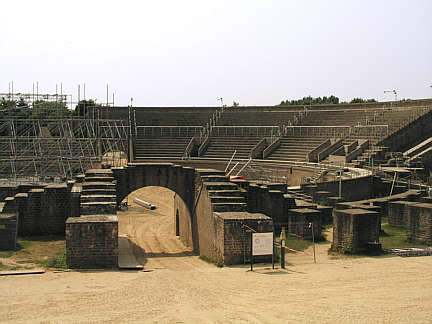 Das Amphitheater ist das einzige Bauwerk, das bis in die Neuzeit sichtbar blieb. Die Arena war durch zwei gegenüberliegende Tore zu betreten, die Zuschauer hatten mehrere Zugänge an der Außenseite.