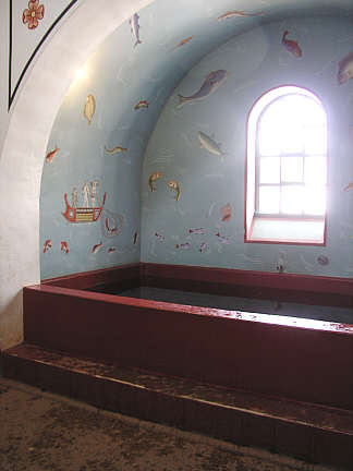 Kaltbad mit gemauerter Wanne und Fresken mit Fisch- und Schifffahrts-Motiven an den Wänden