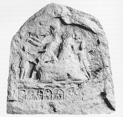 dargestellt, wie er den Stier tötet. Links und rechts stehen die Begleiter