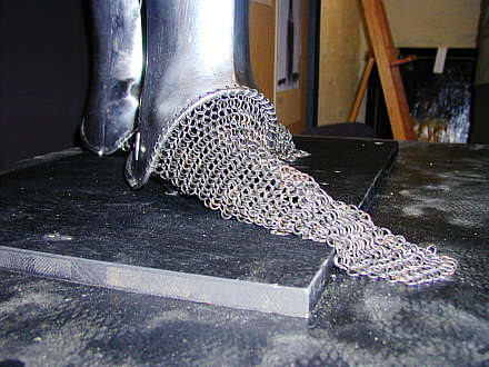 Großaufnahme: Kettenschuh Über dem Kettenschuh wurde noch ein spitz zulaufendes Schnabelblech getragen |