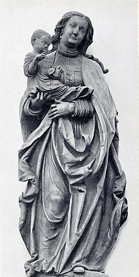 Maria mit Kind Standfigur, Lindenholz, Oberschwaben, um 1520 Maria trägt unter dem weiten Mantel ein plissiertes Obergewand (unter dem linken Arm angedeutet) sowie ein ebenfalls reich plissiertes und am Hals rund geschlossenes Untergewand. Das Obergewand ist rechteckig ausgeschnitten und über der Brust geschnürt. |