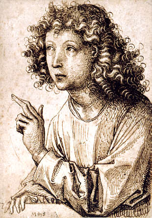 Schongauer arbeitet mit feinen und ausführlichen Parallelschraffuren, um dem Bild eine starke Plastizität zu geben. In der üppigen Lockenpracht suggerieren helle Haarsträhnen neben dicht gesetzten Linien Lichtreflexe auf der von lnks beschienenen Figur, die sich auch auf dem gesicht und dem gefältelten Gewand niederschlagen.